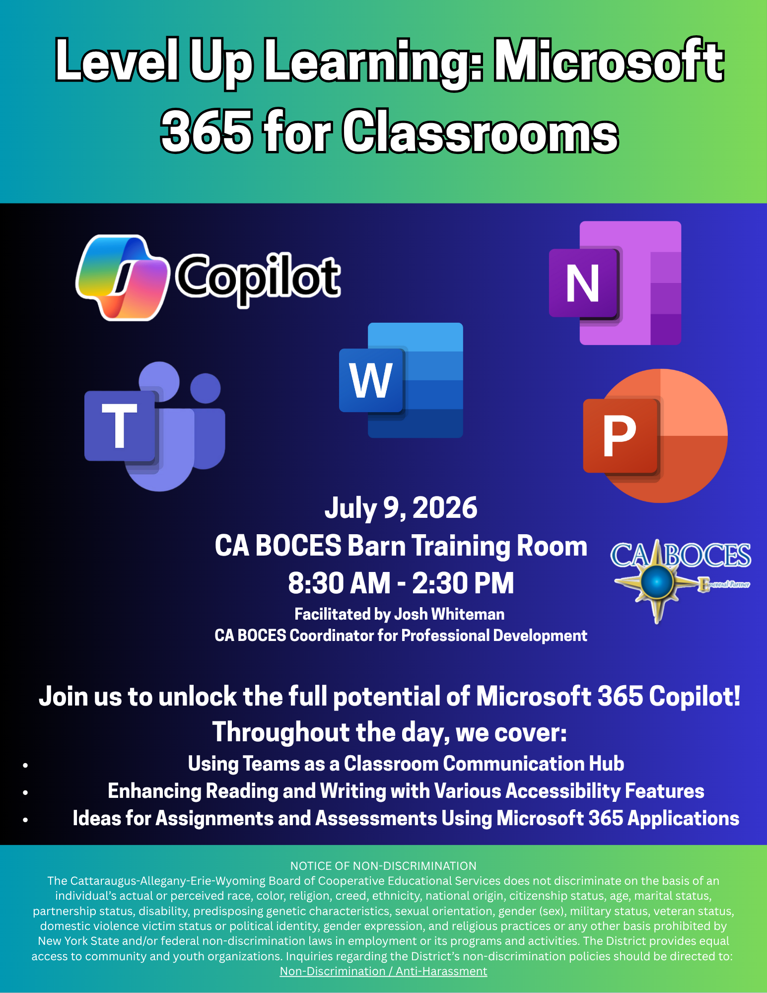 | Workshop Full Desc | This workshop provides educators with practical, classroom-ready strategies for using Microsoft 365 to improve teaching, learning, and daily workflow. Through guided demonstrations and hands-on practice, teachers will learn how to create and organize digital resources, communicate efficiently with students, design interactive lessons, and utilize Microsoft's learning tools to support all learners. Participants will gain skills that can be transferred immediately into their instructional practice. The workshop emphasizes time-saving techniques, student engagement strategies, accessibility tools, and real classroom integration examples. |